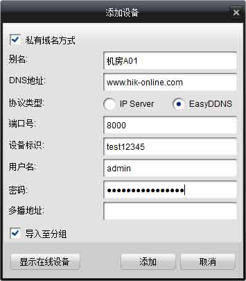 打開iVMS-4200客戶端軟件,進入“設備管理”界面添加設備。選擇私有域名方式添加,協議類型選擇成海康DDNS,填寫設備域名、用戶名、密碼,即可正常使用iVMS-4200客戶端軟件訪問設備。