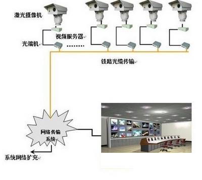 時下,這些設備已在鐵路安防監控系統中發揮實質性的作用,相關方案已用于太原鐵路局(1000余套)、武漢鐵路局宜萬線、廣深鐵路沿線、廣坪鐵路沿線等線路,徹底克服了夜間監控效果差等諸多問題,實現了24小時全天候視頻安全監控。總體實施方案系統結構示意圖如下圖4所示。