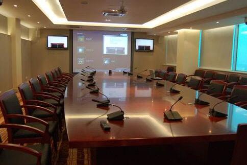 派出所監控中心/會議室配置電視墻與音響設備,實現對各前端監控場所的集中監控。監控中心同時配置有攝像頭、麥克風,均接到矩陣,可以與上級控制中心實現實時互動會話。