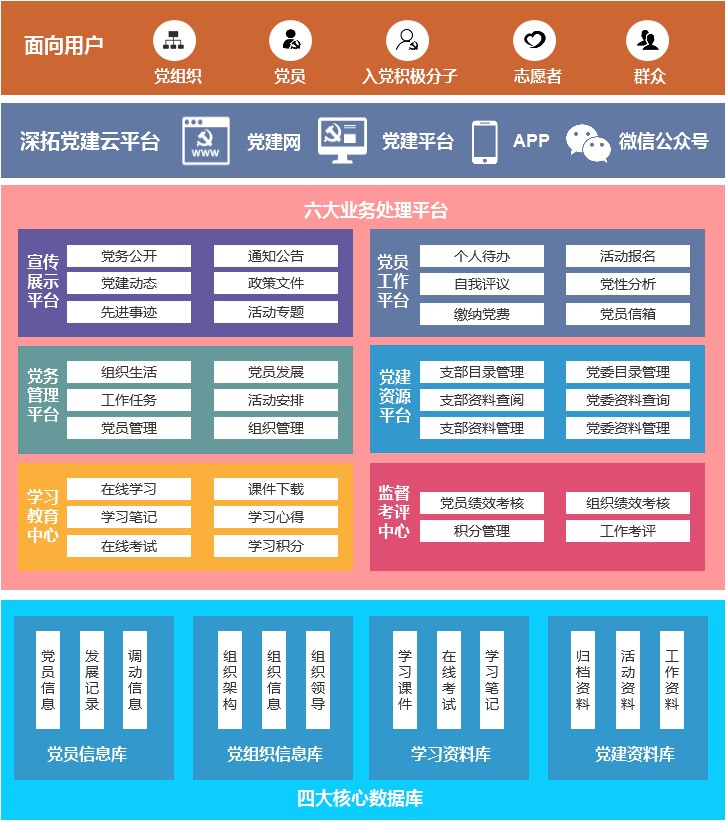 智慧黨建平臺包括“1云4庫6平臺”,一云指的是智慧黨建云,4庫分別是黨員信息庫、黨組織信息庫、學(xué)習(xí)資料庫、黨建資料庫,6平臺分別是:黨建宣傳平臺、黨員學(xué)習(xí)平臺、黨員工作平臺、黨務(wù)管理平臺、監(jiān)督考評平臺、黨建資源平臺。